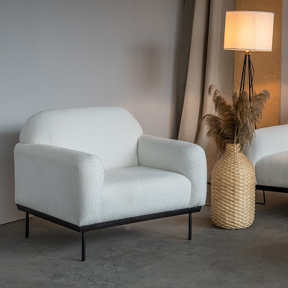 Fotel przyciąga uwagę swym wyjątkowym, subtelnym designem i stylową tkaniną. Posiada miękkie oparcie i siedzisko oraz podłokietniki, które zapewnią dodatkowy komfort. Materiał obiciowy to przyjemna w dotyku i elegancko prezentująca się tkanina boucle, która sama zachęca swojego właściciela do chwili relaksu.